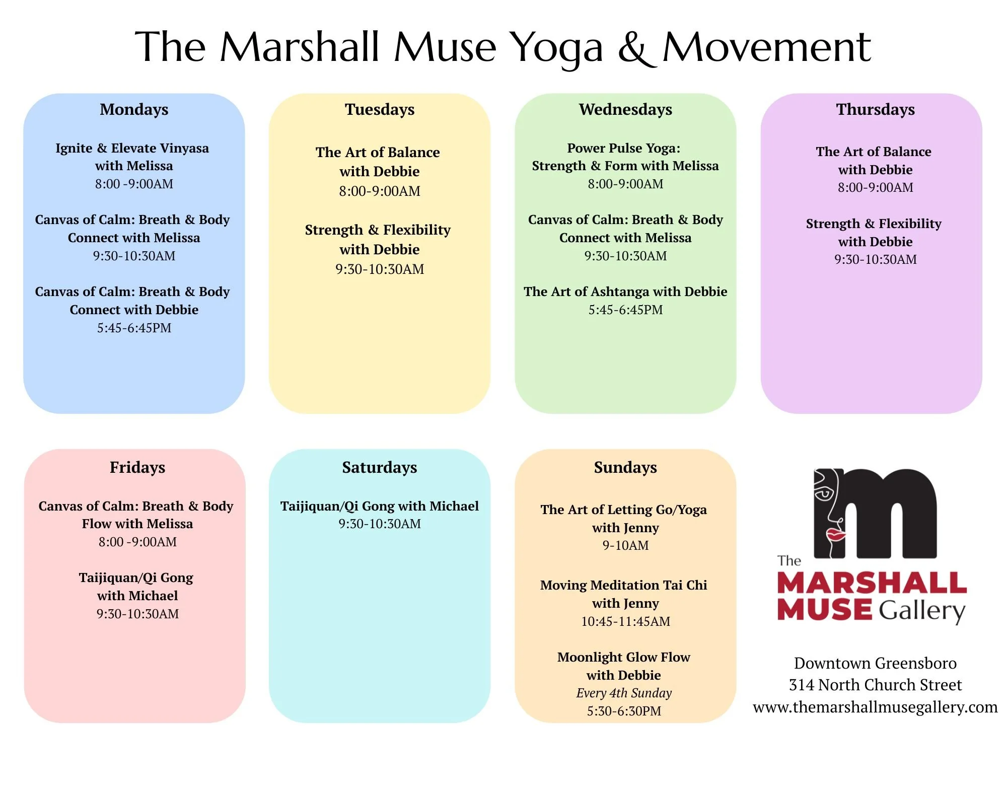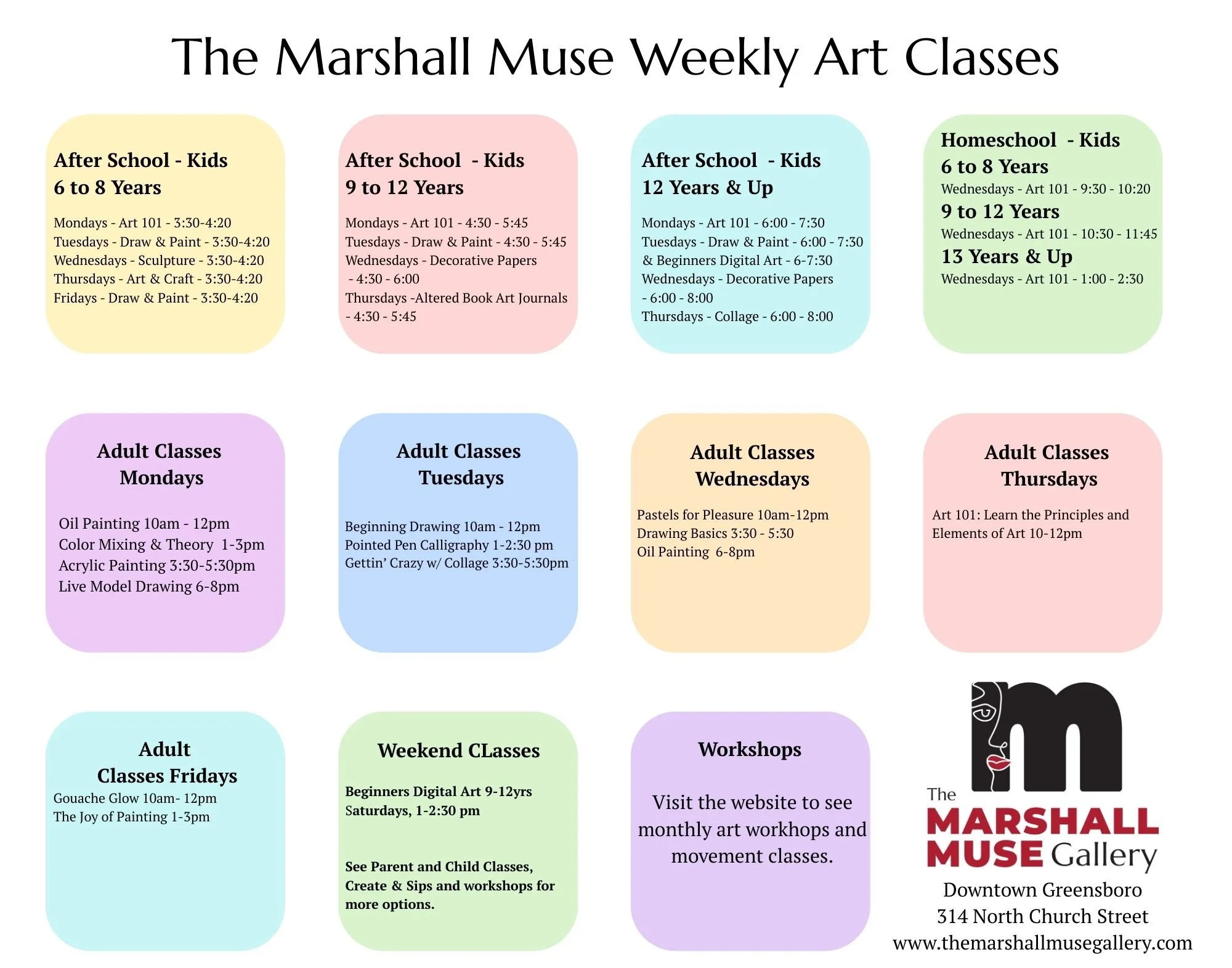 At The Marshall Muse Gallery, there’s always something new to explore. This evolving page brings together quick access to all of our creative learning opportunities in one place: art classes for all ages, family sessions, movement offerings, and our beloved monthly Signature Events. This page makes it easy to find exactly what inspires you so that you can jump into the vibrant art community we’re building here in Greensboro.