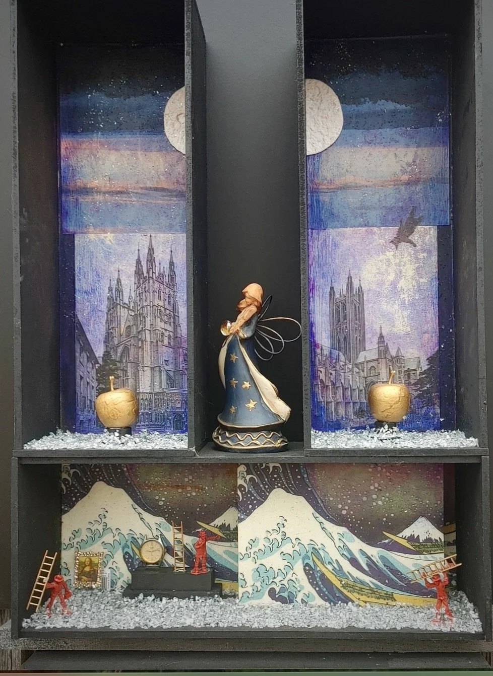 My creative process is bifurcated: Often, I paint directly in plain air with oils or watercolor, responding to nature’s rhythms, movement and color sensations as they reveal themselves. Alternatively, I construct allegorical reliquaries using bricolage; rearranging and juxtaposing previously unconnected signifying objects to produce new meanings in fresh contexts. My art making seeks to illuminate the ineffable; those significant emotions impossible to be described with language.